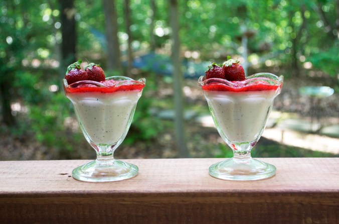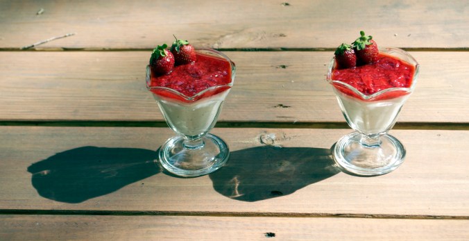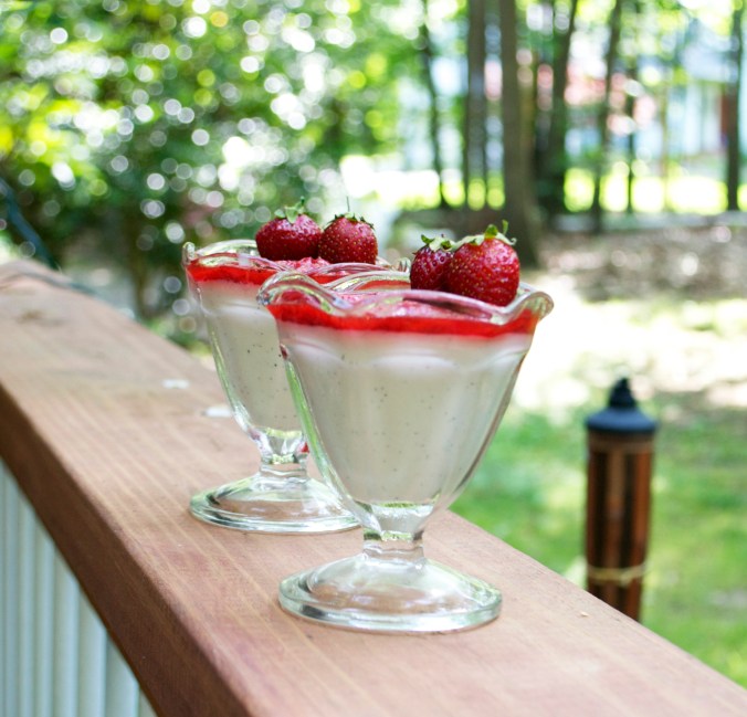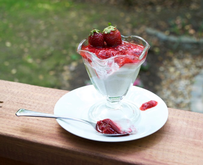 This dessert is so simple & elegant. The texture is silky & smooth. The flavor is wonderful and unique. And the strawberry sauce is the perfect compliment with a splash of brightness. It embodies summertime. In your mouth. So I suggest you make it. And then eat it.