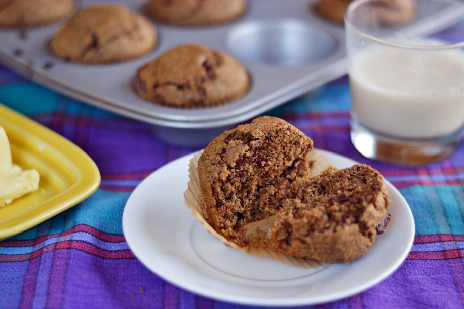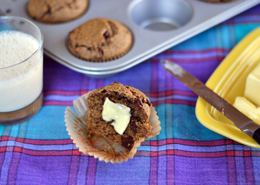 *I used dairy-free chocolate – half Ghirardelli Semisweet Chocolate Chips & half chopped Ibarro Mexican Chocolate. The Mexican chocolate is full of granulated sugar & adds a nice sugary crunch to the muffins. Feel free to use as much chocolate, or little as you like – keeping in mind that it may affect the volume of the batter.