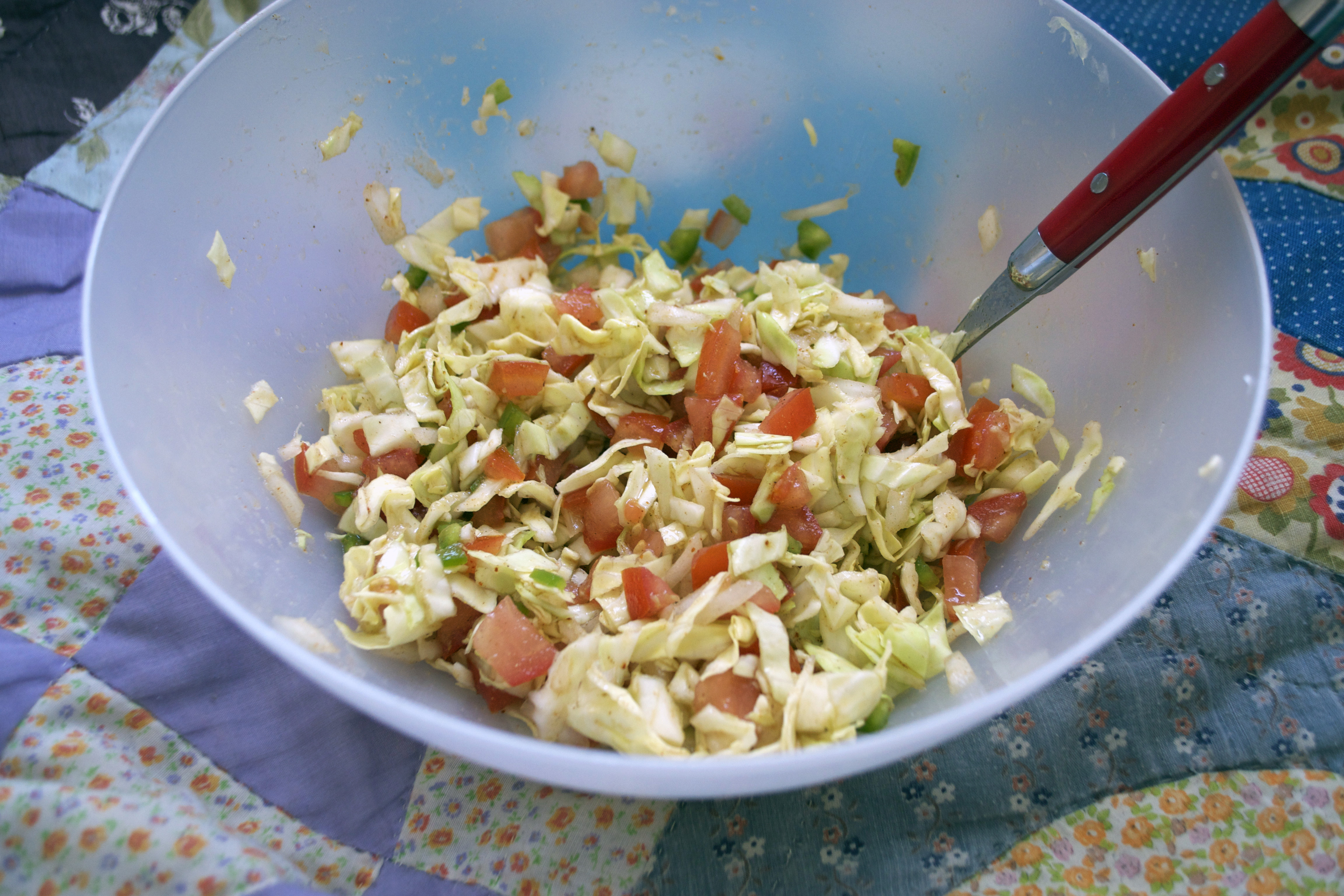 In a medium/large bowl combine cabbage, tomatoes, onion, jalapeño and garlic. Toss together. Squeeze in lime juice. Add cumin & chipotle. Toss & taste. You may decide not to add sweetener or salt. I liked a little of both. Definitely be careful with the sweetener though. I accidentally added a touch too much the first time I made it.
