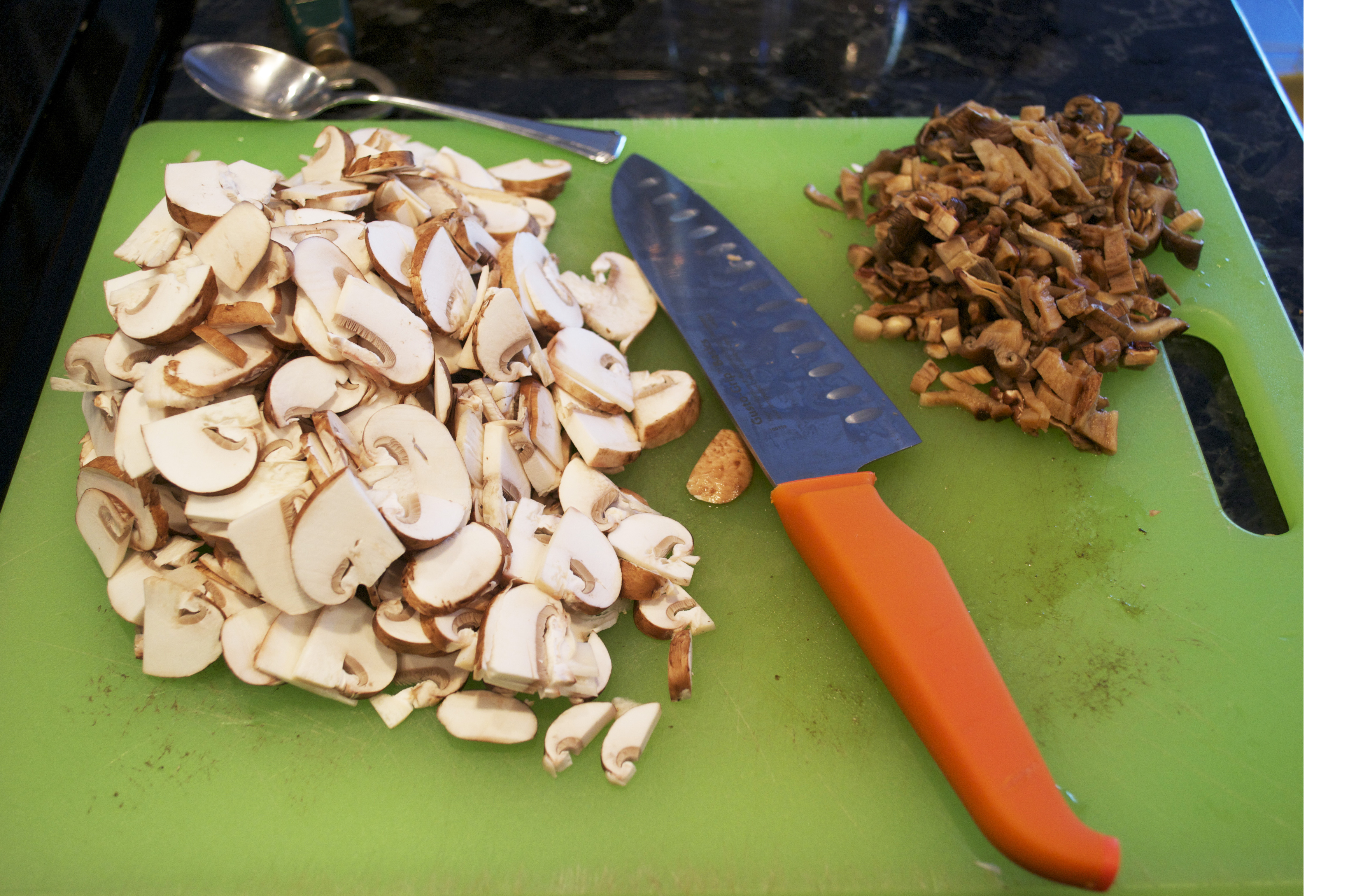 Soak the dried mushrooms in 5 cups of hot water and let sit for about 15 minutes or until reconstituted. Remove the mushrooms from the water and set the water aside to use to cook the risotto. Dice the mushrooms and add to diced fresh mushrooms.